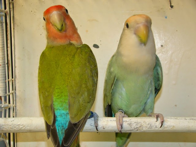 4. Balra egy normál zöld egyfaktoros viola madár, mellette jobra egy misty egyfaktoros törpepapagáj